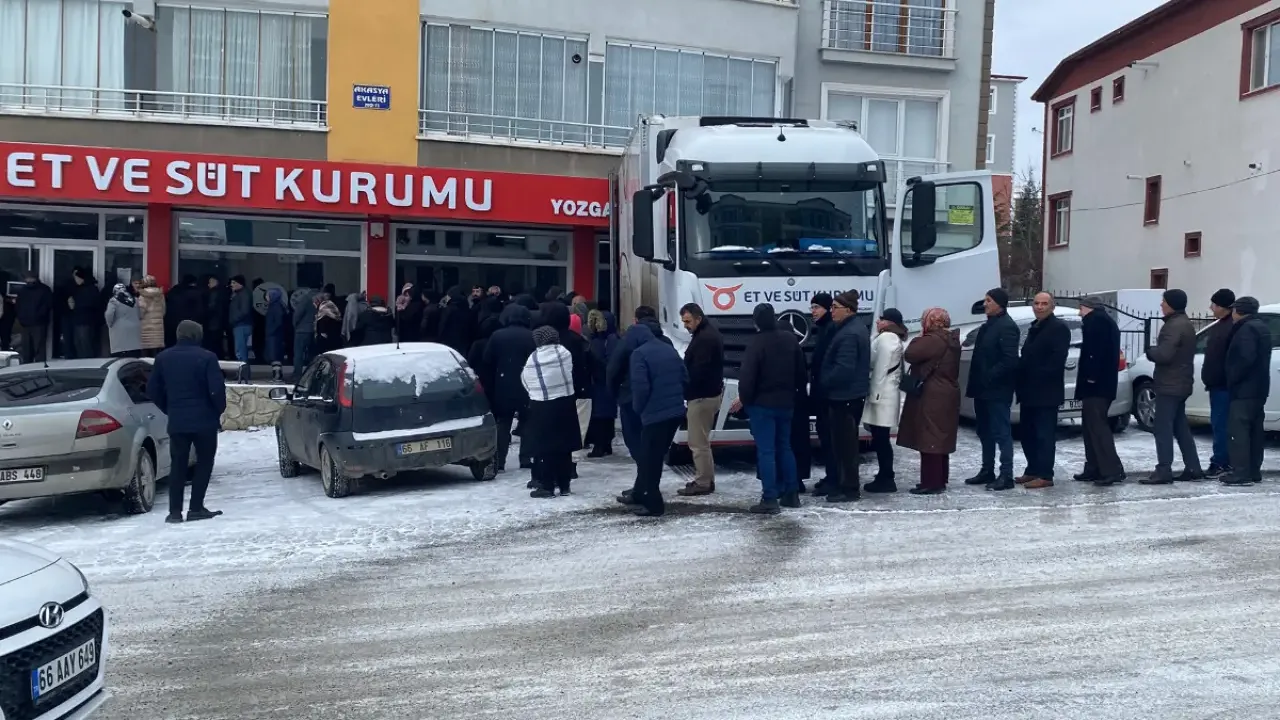 Yozgat’ta yüzlerce yurttaş, Et ve Süt Kurumu (ESK) mağazası önünde soğuk hava ve kar yağışına rağmen uzun kuyruklar oluşturdu. Yaklaşık 9–10 kiloluk paketler halinde satılan dondurulmuş kıyma ve dana etinden alabilmek isteyen vatandaşlar, eksi 4 dereceyi bulan soğukta saatlerce bekliyor.